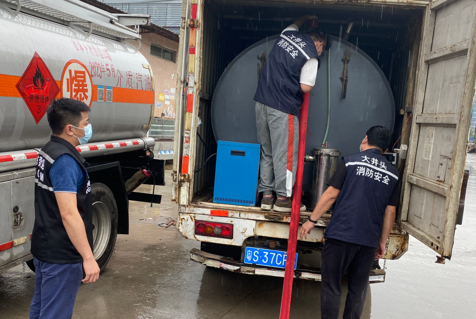 6月7日,大朗公安分局检查人员在大井头社区日常巡查时,发现某物流中心停放有疑似“黑油”车辆。镇经发、公安、市场监督、应急管理分局以及大井头社区工作人员接报后迅速采取联合行动。